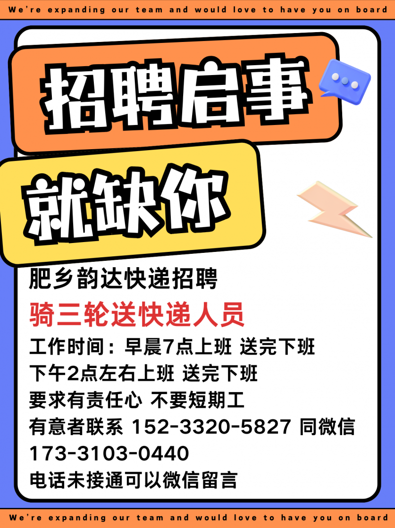 肥乡韵达快递招聘 骑三轮送快递人员 工作时间:早晨7点上班 ,送完下班。下午2点左右上班,送完下班 要求有责任心,不要短期工 有意者联系 电话未接通可以微信留言