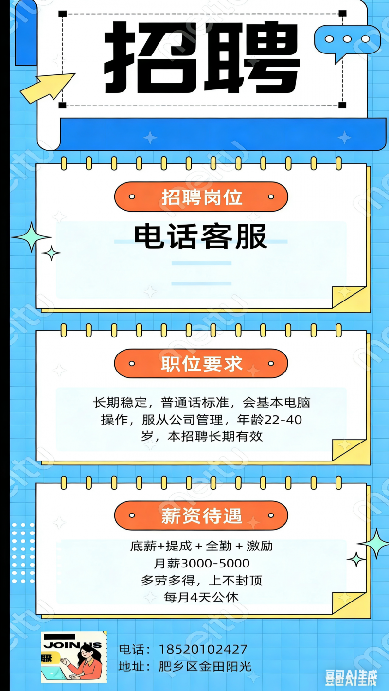 招聘 电话客服 职位要求:长期稳定,普通话标准,会基本电脑操作,服从公司管理,年龄22-40岁,本招聘长期有效 薪资待遇:底薪+提成+全勤+激励月薪3000-5000多劳多得,上不封顶每月4天公休 地址:肥乡区金田阳光