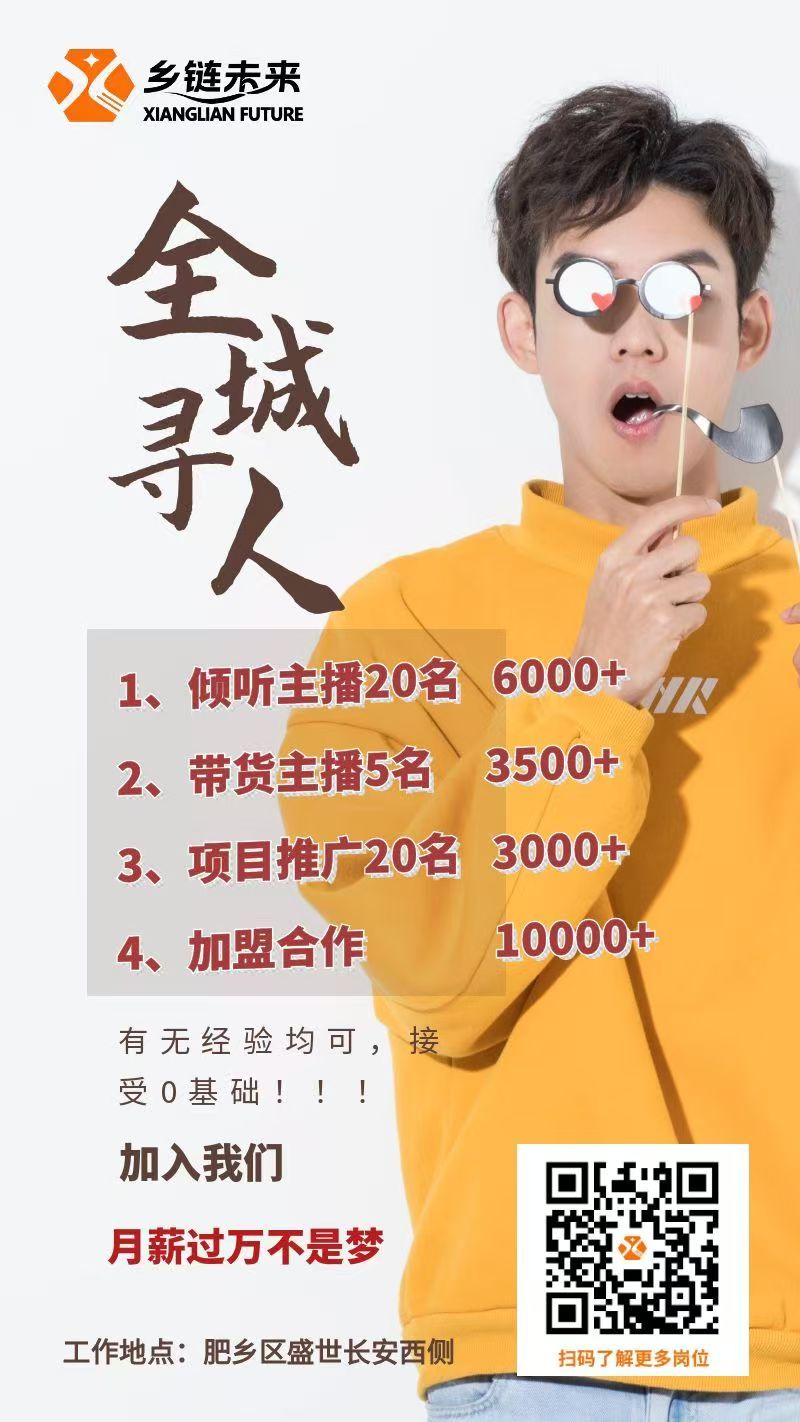 乡链未来科技招聘 1. 倾听主播 20 名 25-40 岁 6000+ 可住宿 2. 带货主播 5 名 18-40 岁 3500 + 提成 工作地点:肥乡城区