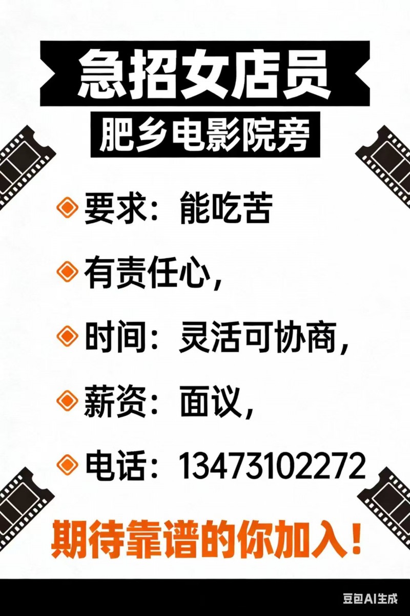 店员招聘 诚聘女性店员一名 要求:吃苦耐劳,具备强烈责任心 工作地址:肥乡电影院附近 工作时间:灵活可调,具体面议 薪资待遇:面谈 期待踏实肯干的你加入!
