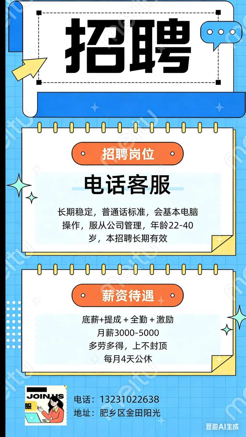 招聘信息 电话客服 长期稳定 普通话标准 会基本电脑操作 服从公司管理 年龄22-40岁 本招聘长期有效 薪资待遇:底薪+提成+全勤+激励 月薪3000-5000 多劳多得 上不封顶 每月4天公休 地址:肥乡区金田阳光
