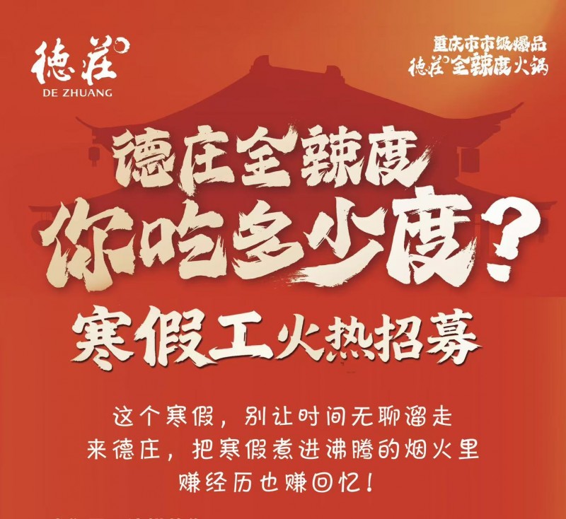 肥乡德庄火锅招聘:服务员10名(女) 传菜生4名(男 寒假工数名要求:年龄18到24岁 地址:肥乡一期小区西侧路北重庆德庄火锅