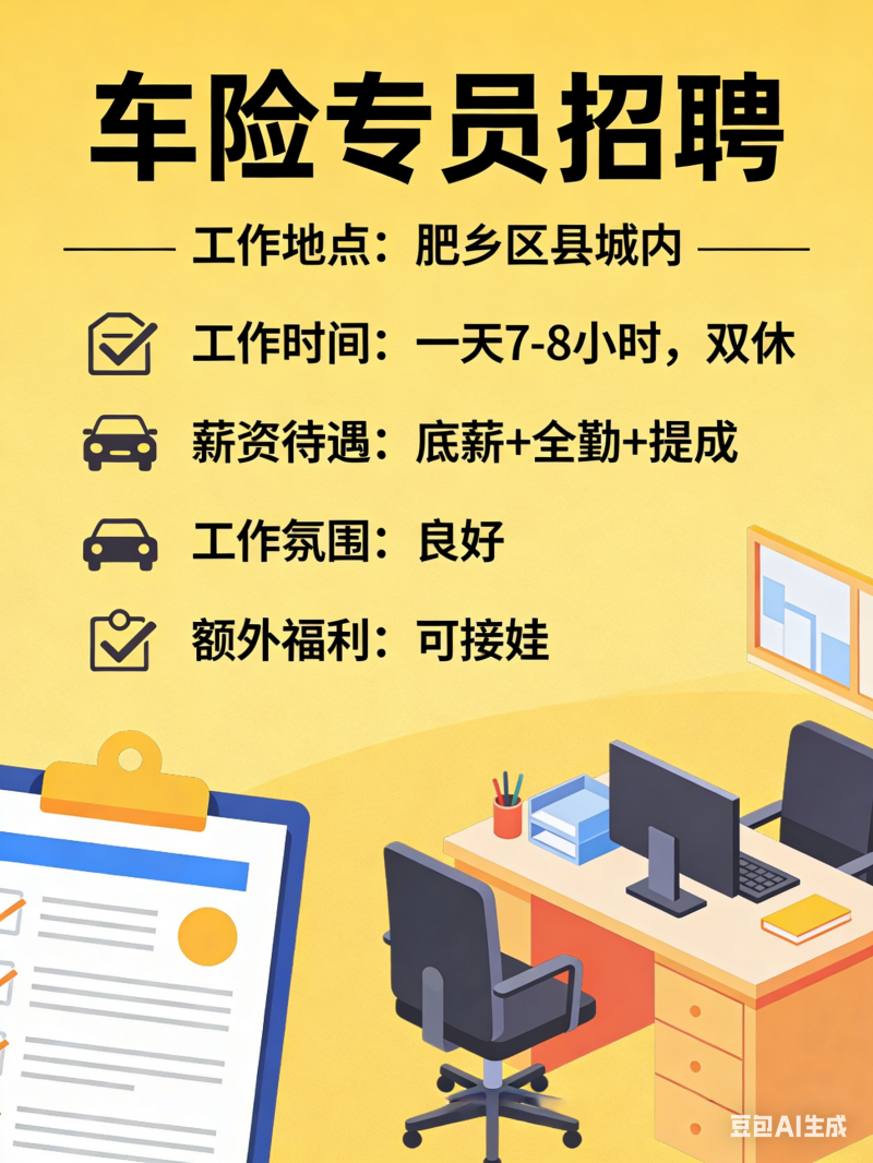 车险专员招聘(可接娃/双休)岗位职责:负责车险相关业务咨询、客户维护、出单跟进等基础工作,上手简单。任职要求:有耐心、沟通能力强,有无经验均可,专人带教。工作时间:每天7-8小时,周末双休,时间宽松,方便接送孩子,工作生活两不误。薪资待遇:无责底薪全勤奖高额提成,收入上不封顶,多劳多得。工作氛围:团队年轻和睦、氛围轻松,无复杂职场关系,稳定靠谱。有意向可直接联系,期待踏实稳定的你加入!