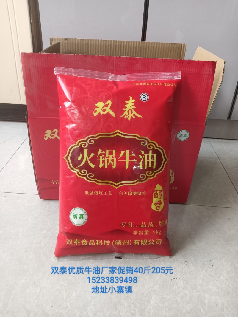 双泰优质牛油,纯牛脂精炼而成,不起沫,不溢锅,无异味,脂香味浓,色泽纯正,清真食品,适合板面店,火锅店,和所有用的牛油的场景,有40斤的大包装,还有10斤的小包装,可以试用,做餐饮的老板如果您觉得的自己的餐品不尽如意,给自己也给我们一次机会,尝试一下双泰牛油,您会有意想不到的收获,随时欢迎来电,微信同号