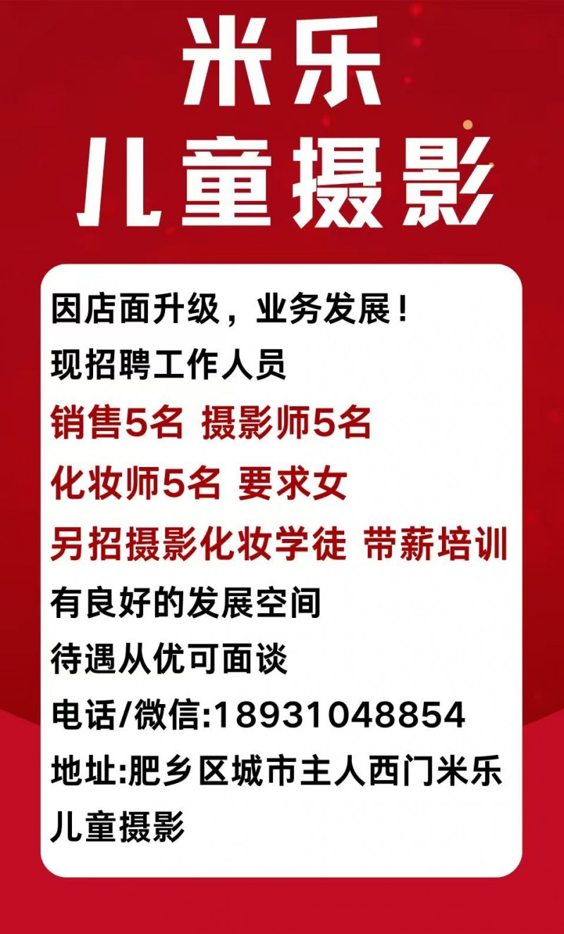 米乐儿童摄影,因店面升级,业务发展! 现招聘:摄影师5名,要求女,另招摄影化妆学徒,带薪培训,有良好的发展空间,待遇从优,