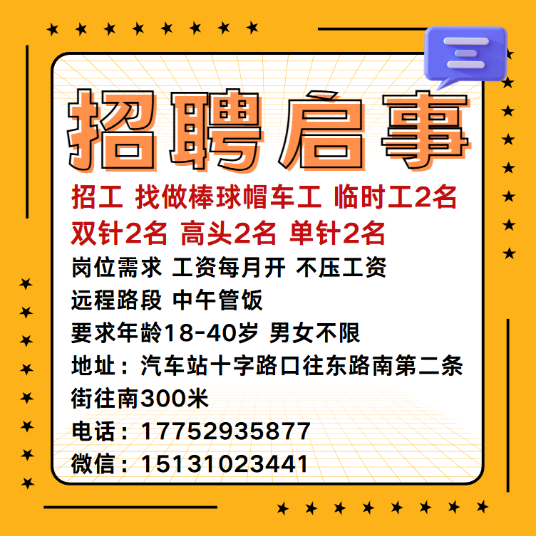 招聘:找做棒球帽车工 临时工2名 ,双针2名 ,高头2名, 单针2名,