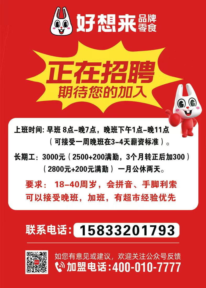 好想来电影院店招聘 长期理货员 月休2天 工资2500-3000