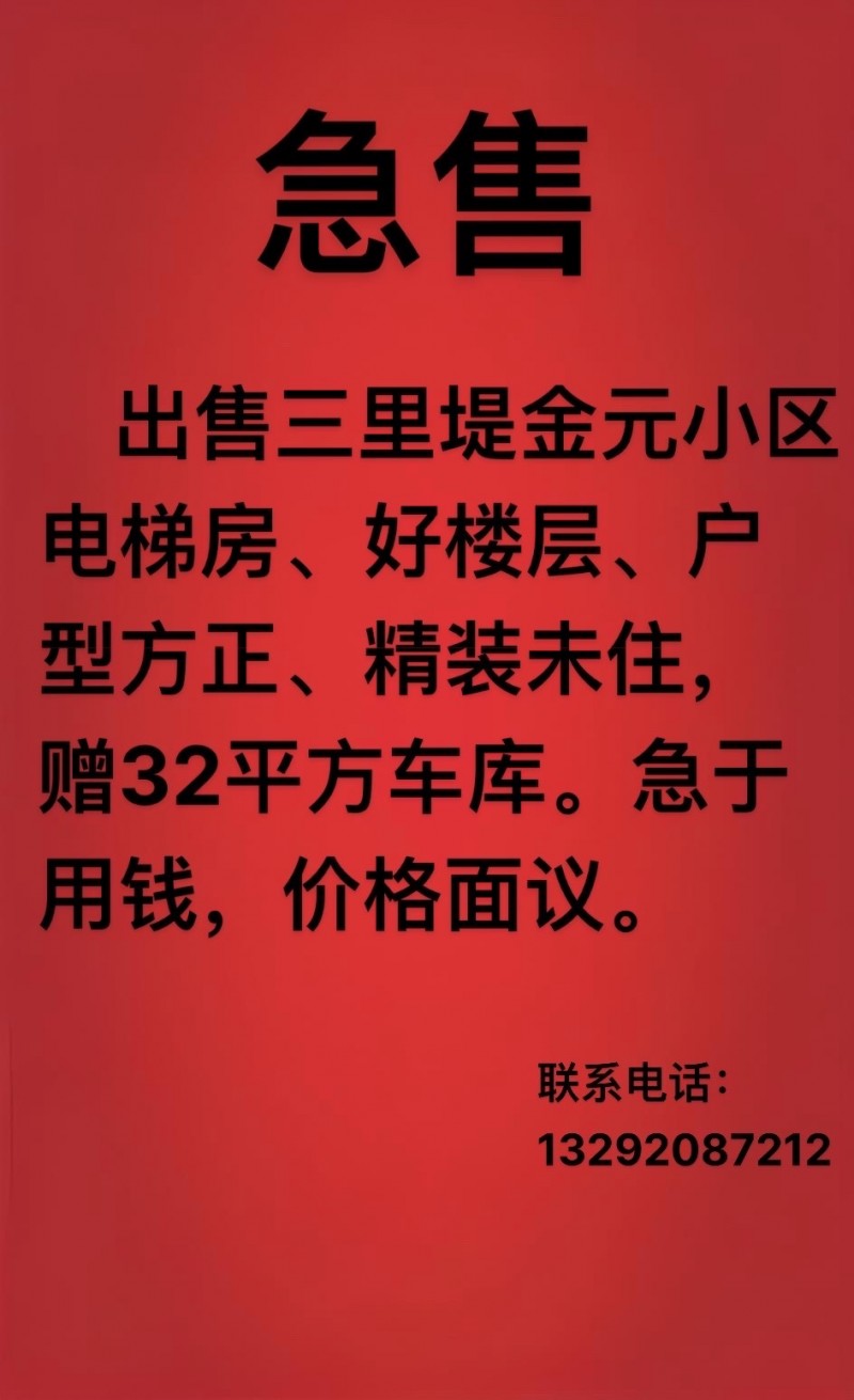 出售三里堤金元小区电梯房、好楼层、户型方正、精装未住,赠32平方车库。急于用钱,价格面议
