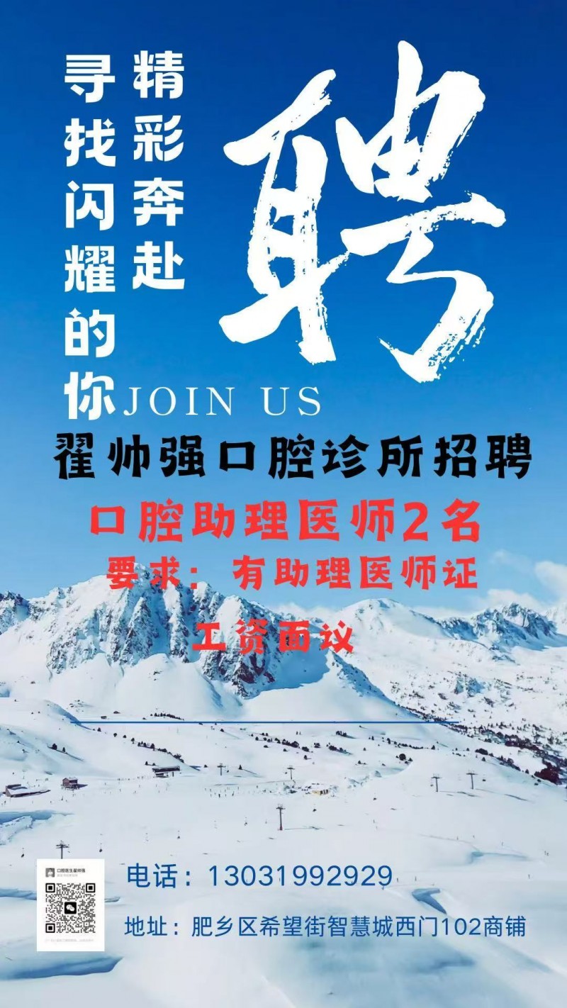 翟帅强牙科诊所招聘口腔助理医师两名。要求:有口腔助理医师证。工资面议。