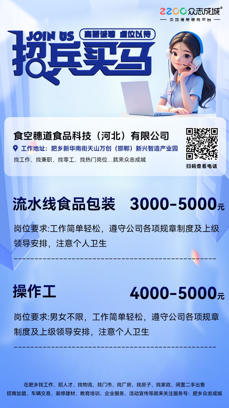 工作内容:流水线食品包装; 岗位要求:工作简单轻松,遵守公司各项规章制度及上级领导安排,注意个人卫生; 薪资待遇:3000-5000 工作内容:操作工 岗位要求:男女不限,工作简单轻松,遵守公司各项规章制度及上级领导安排,注意个人卫生; 薪资待遇:4000-5000