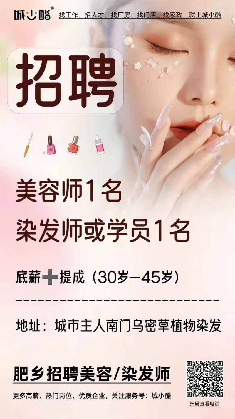 乌密草招聘启事 招聘岗位 ✔️店员2名 月休2天(工资底薪+提成) ✔️学徒1名 ⏰工作时间:(具体到店详谈) 任职要求: ⭐️年龄30—50岁 ⭐️长期工,勤劳能干 ⭐️热爱服务行业,重点人品要好 地址:城市主人南门东行200米路北乌密草 ⭐️期待热爱美业,积极向上的你