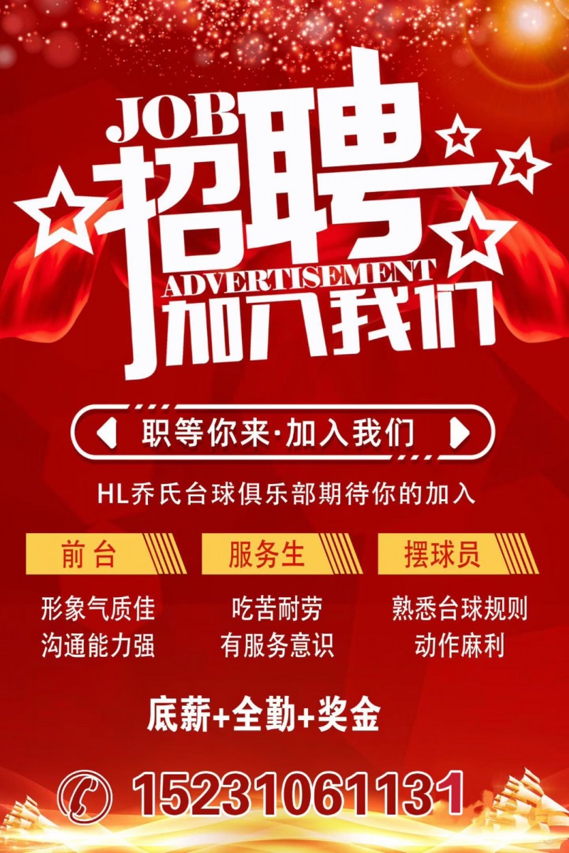 HL乔氏台球俱乐部,招聘前台,非诚勿扰 地址:肥乡区万浩新城(希望街西)