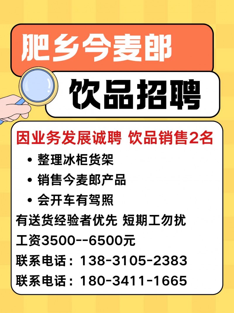 肥乡今麦郎饮品 因业务发展诚聘:饮品销售2名 1、整理冰柜货架 2、销售今麦郎产品 3、会开车有驾照 有送货经验者优先 短期工勿扰 工资3500--6500元