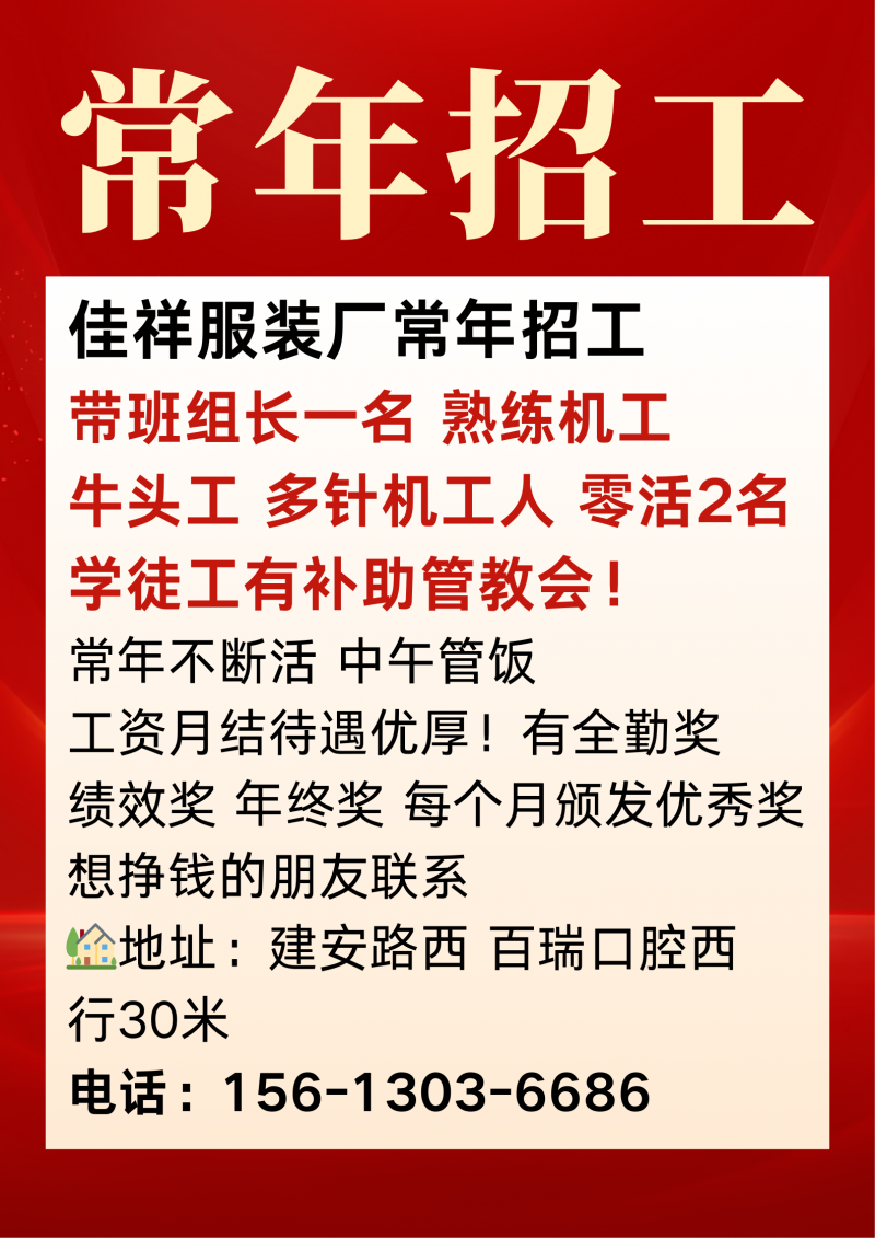 佳祥服装厂常年招工 带班组长一名,熟练机工,牛头工 多针机工人,零活2名,学徒工有补助管教会! 常年不断活,中午管饭,工资月结待遇优厚! 有全勤奖.绩效奖!年终奖!每个月颁发优秀奖! 想挣钱的朋友联系 地址:建安路西,百瑞口腔西行30米