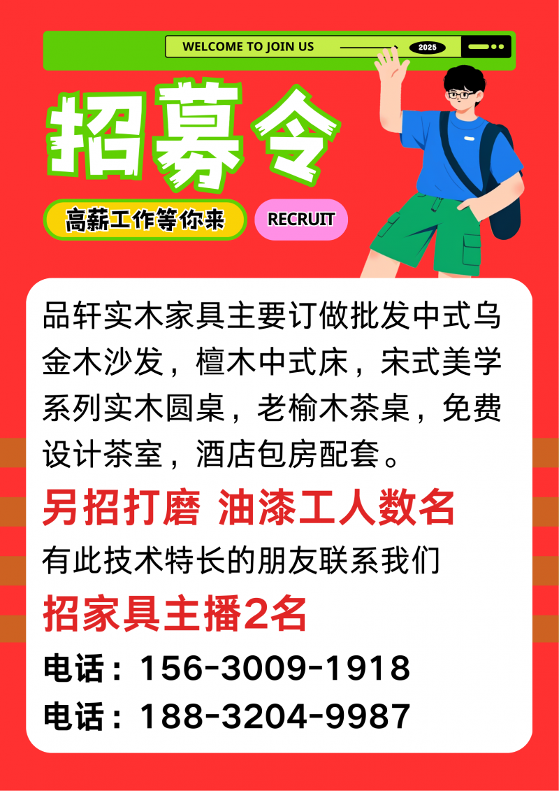 品轩实木家具主要订做批发中式乌金木沙发,檀木中式床,宋式美学系列实木圆桌,老榆木茶桌,免费设计茶室,酒店包房配套。 招打磨 油漆工人数名 有此技术特长的朋友联系我们